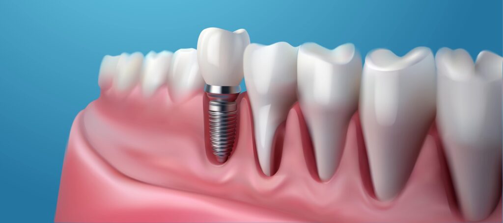 - Abutment: A small connector piece that screws into the implant post and extends above the gum line.