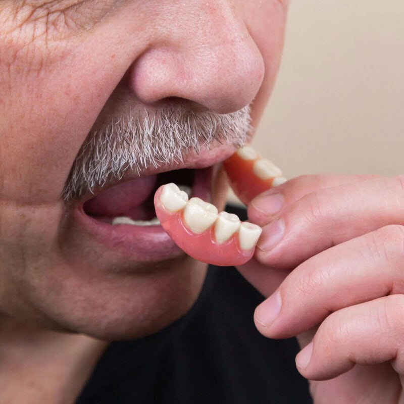 Dentures are REMOVABLE teeth inserts made (mostly) from resins . They can be used to replace a few teeth (called Partial Denture) or for all teeth (called Full dentures).
